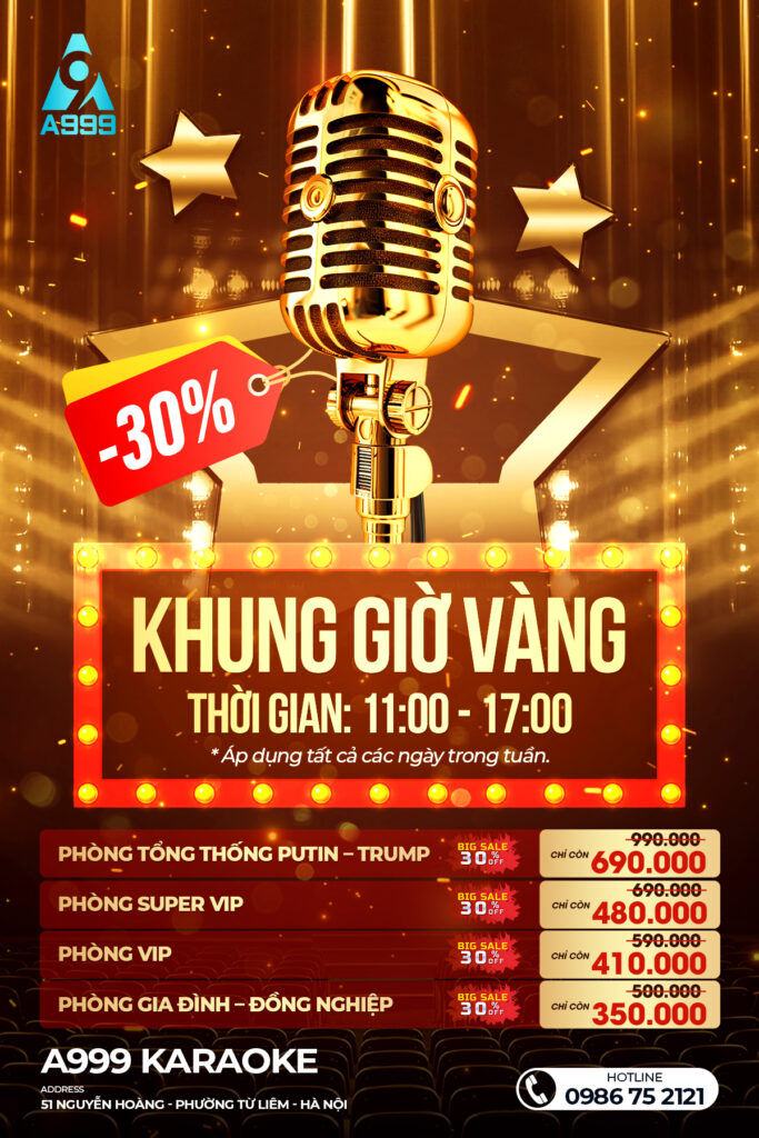 Bạn đang tìm kiếm một địa điểm karaoke sang trọng, giá hợp lý và có nhiều ưu đãi đặc biệt trong khung giờ trưa? KARAOKE A999 chính là lựa chọn lý tưởng cho bạn. Với chương trình khuyến mãi hấp dẫn “Khung Giờ Vàng”, bạn sẽ được tận hưởng không gian giải trí đỉnh cao với mức giá siêu ưu đãi.